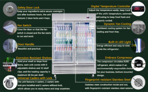 • Our 54″W commercial refrigerator uses R290 refrigerant and comes with high-performance Embraco compressor, Carel controller, fan cooling system, automatic defrost function and LED light.